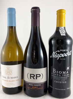 Conjunto exclusivo de 3 garrafas. Stock único.Este conjunto inclui:2024 Casal Sta. Maria Sauvignon Blanc branco2007 Roma Pereira tintoNiepoort Bioma Crusted Porto (engarrafado em 2014)Envio gratuito para Portugal Continental.(imagem meramente ilustrativa)Campanha exclusiva online e válida de 08/04/2026 até 15/04/2026 às 23h59, limitada ao stock existente e não acumulável com outras campanhas em vigor. A Garrafeira Nacional reserva-se no direito de adicionar ou retirar produtos da promoção assim como alterar os preços sem aviso prévio.